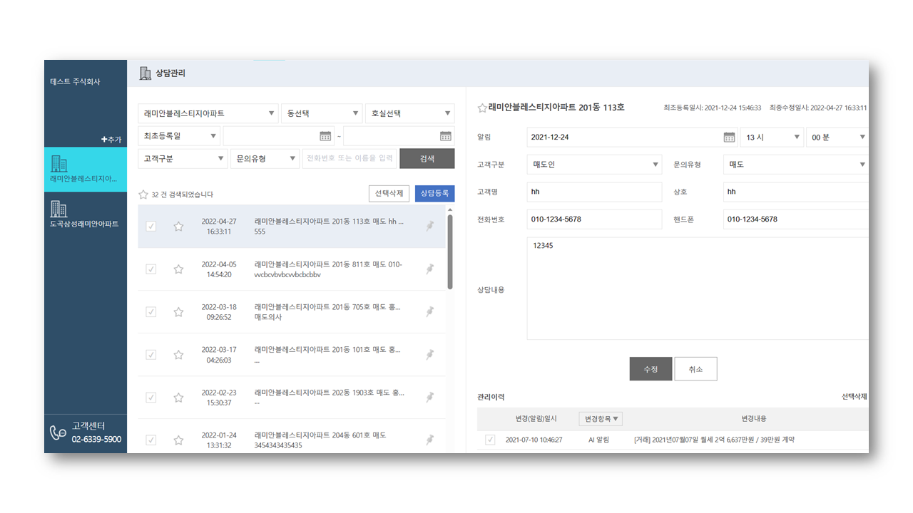 호실 별 제공된 기본 데이터를 기반으로, 나의 중개업소에 방문한 고객이 소유자인지, 세입자인지 체크할 수 있고 상세한 문의 유형을 구분 지어 다음 상담 때 활용할 수 있습니다.